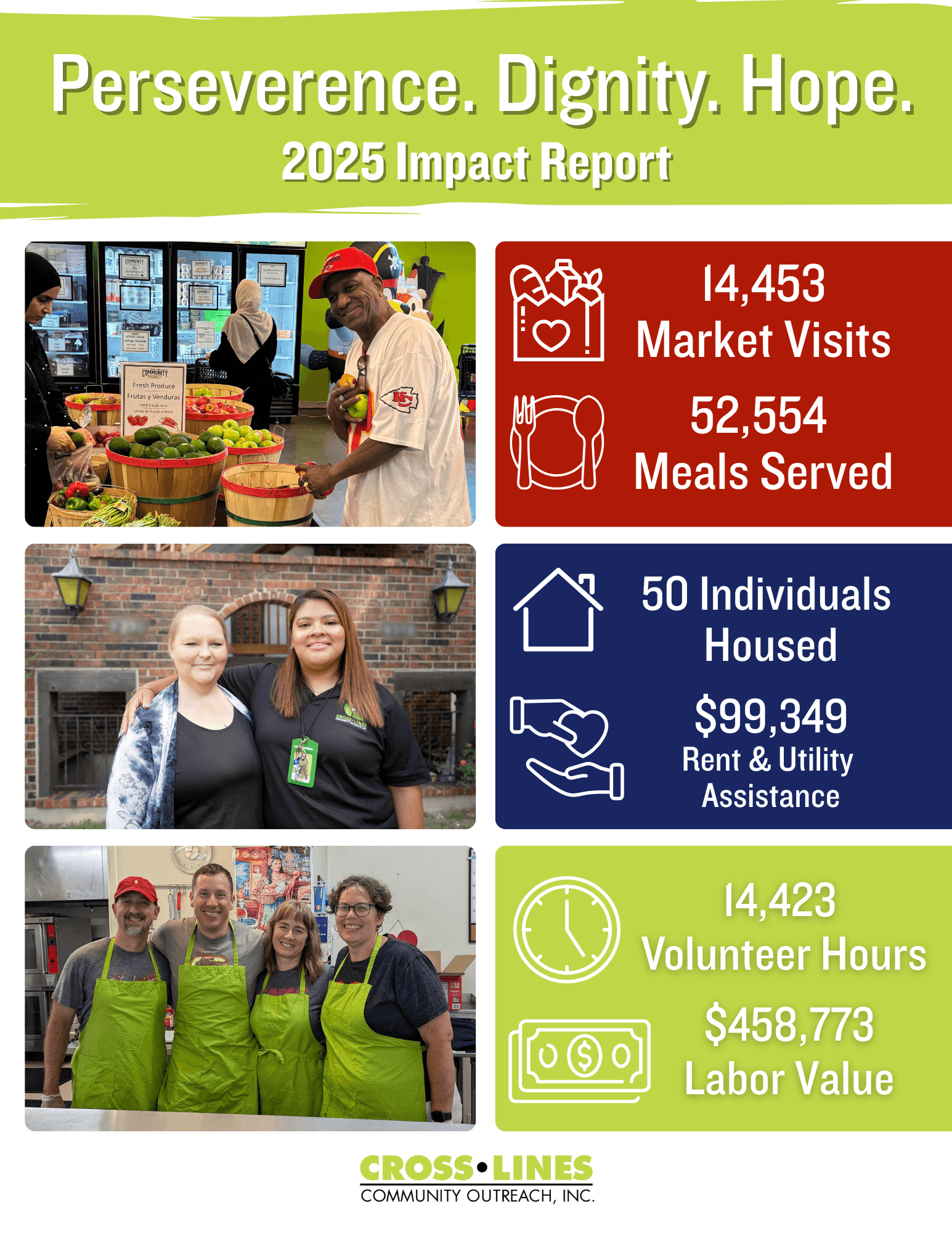 Because of the compassion and commitment of our supporters, volunteers, partners, and staff, Cross-Lines continues to be a place where people find both immediate relief and pathways to stability. In 2025, thousands of individuals and families turned to Cross-Lines for food, housing support, and connection to critical resources. Together, we celebrated meaningful milestones, over 14,000 visits to The Community Market, over 52,000 meals served in the Community Kitchen, and dozens of neighbors moving into stable housing.